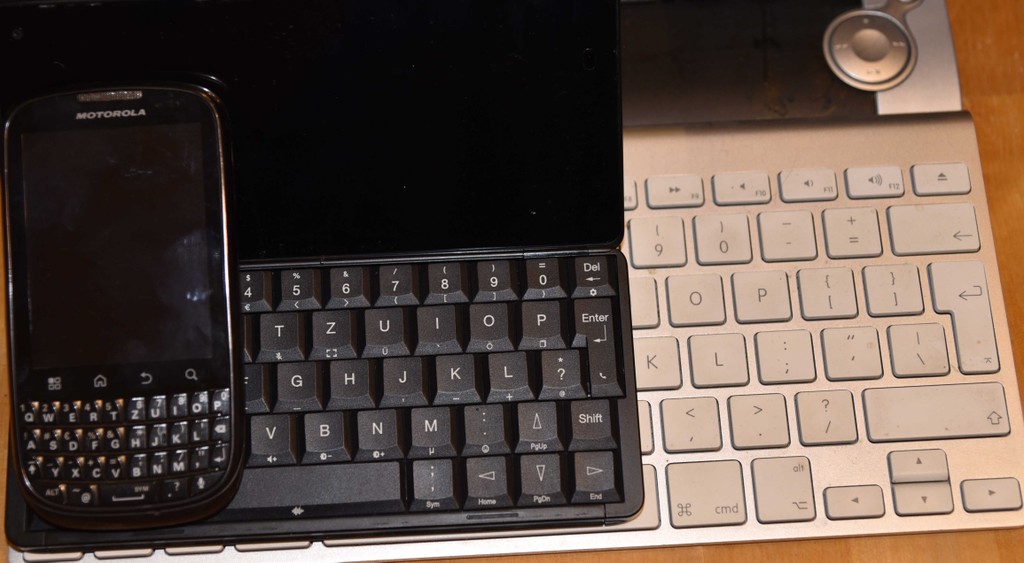 Seitdem ich Handys habe ist das ja nicht so richtig gut geloest. Der Nokia Comminucator hatte Tasten. Danach ein paar Windows Phones mit Tasten. Das erste Android Handy - das HTC G1 hatte Tasten. Diverse Handys im Blackberry Style hatten laecherlich kleine Tasten. Und in den letzten Jahren hatte ich am Nexus 5 und dann am 5X eine Bluetooth Tastatur mit in einer Ledertasche, sodass sich das zusammen ein bisschen wie ein vollwertiges Handy angefuehlt hat. Aber keine der Tastaturen ist annaehrend so gut, wie die vom Planet Gemini. Ich hab mal einige Geraete zum Vergleich auf ein Foto gepackt.